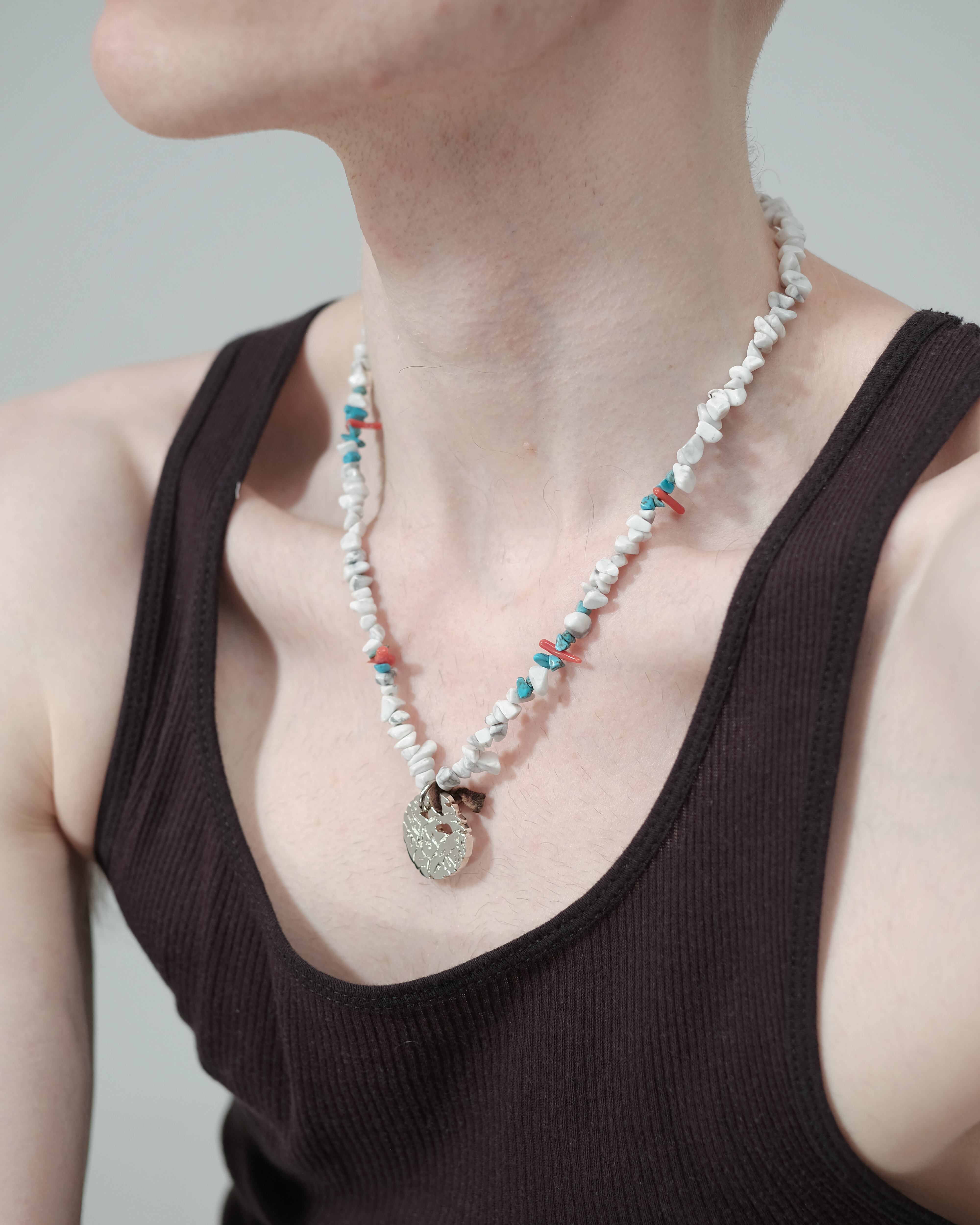 エンブレム付き天然ビーズネックレス。